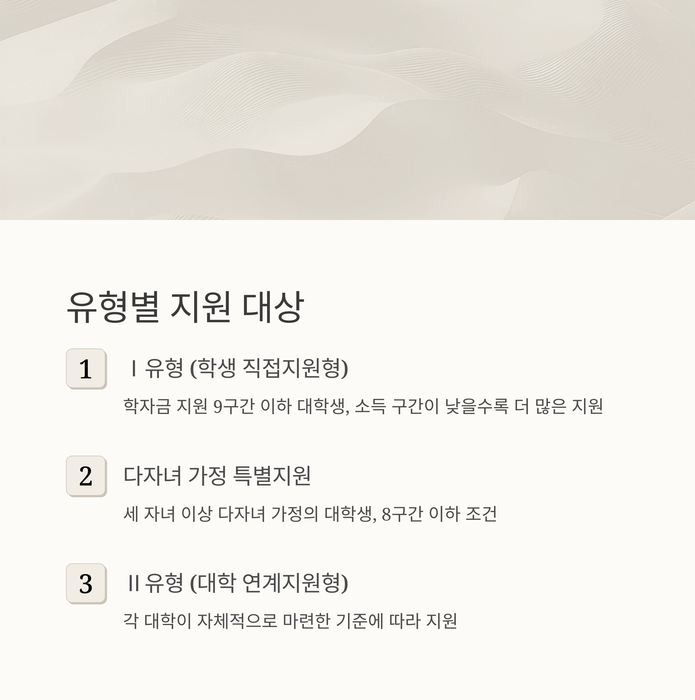 가장 대표적인 유형으로, 학자금 지원 9구간 이하 (중위소득 300% 이하) 대학생 중 성적 기준을 충족한 학생을 대상으로 합니다. 소득 구간이 낮을수록 더 많은 지원을 받을 수 있으며, 기초생활수급자와 차상위계층은 등록금 전액을 지원받습니다.