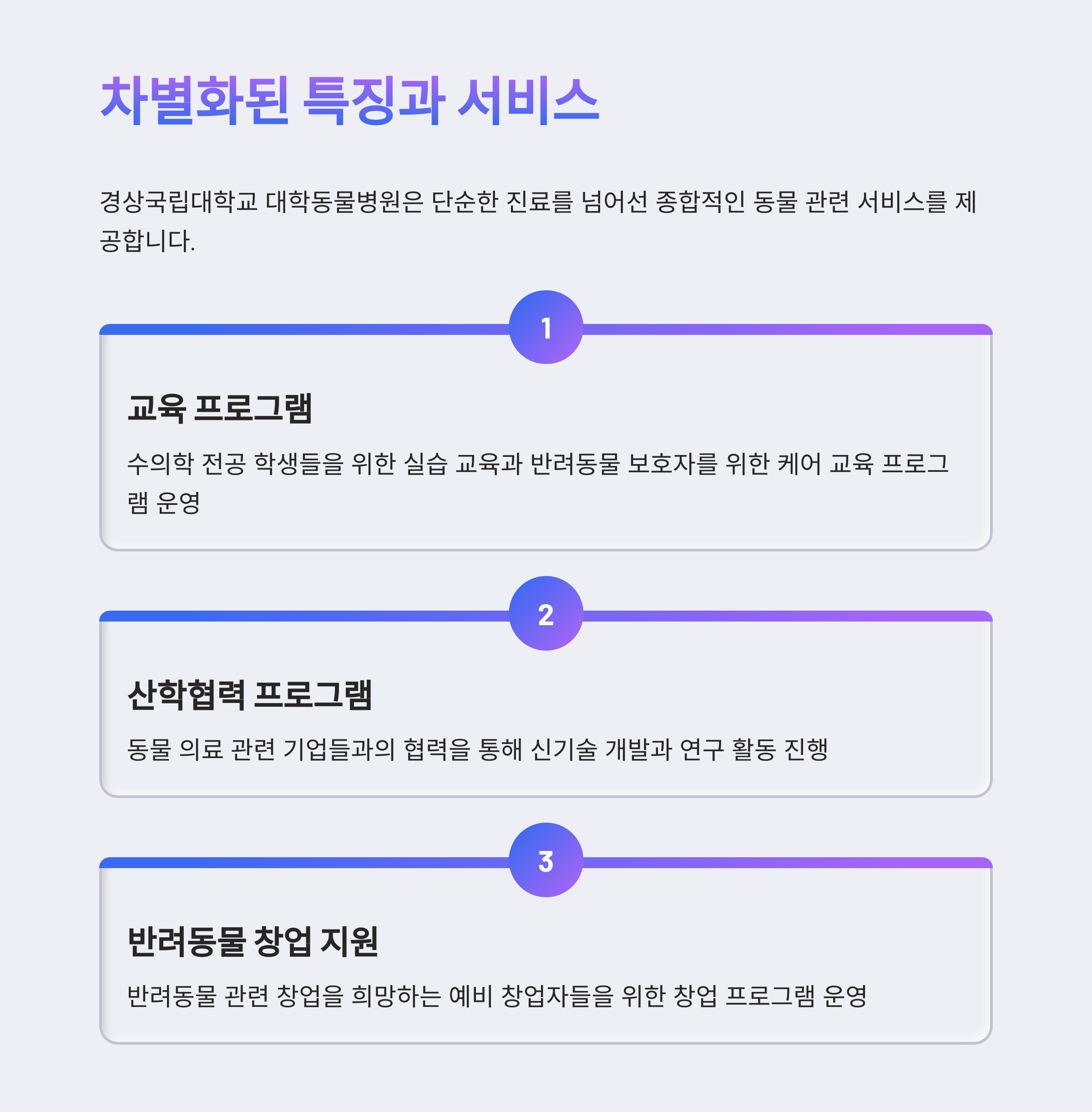 경상국립대학교 대학동물병원의 가장 큰 차별점은 단순한 진료를 넘어선 종합적인 동물 관련 서비스를 제공한다는 점입니다. 이는 기존의 일반 동물병원과는 완전히 다른 접근 방식입니다.