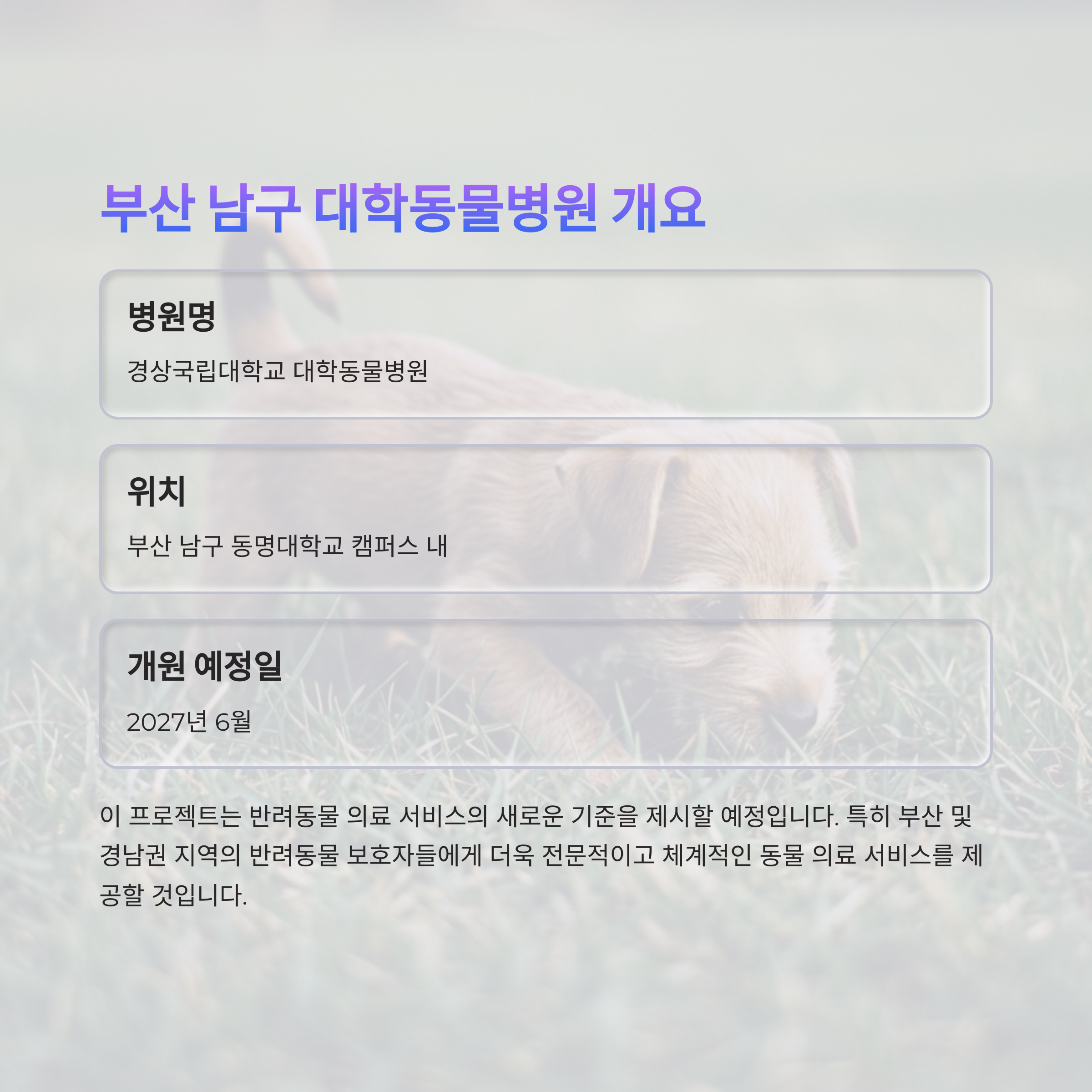 2027년 개원을 앞두고 있는 경상국립대학교 대학동물병원은 부산 지역을 넘어 전국의 반려동물 의료 서비스 발전에 기여할 것으로 기대됩니다. 특히 교육, 연구, 진료가 통합된 종합적인 서비스 모델은 다른 지역에도 좋은 모범사례가 될 것입니다.