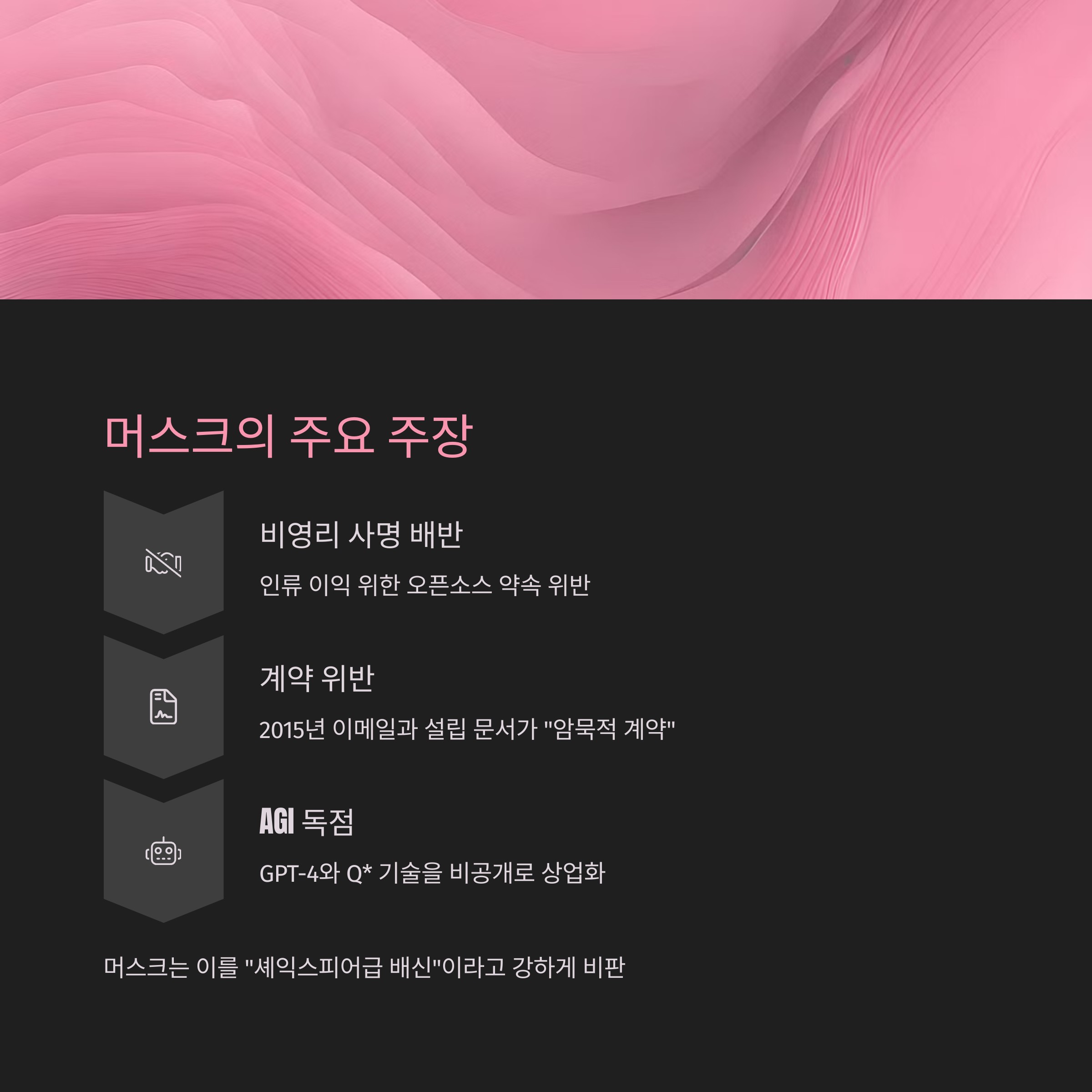 머스크는 오픈AI가 설립 당시 약속한 비영리 사명을 위반했다고 주장하며 다음과 같은 이유로 소송을 제기했습니다:
