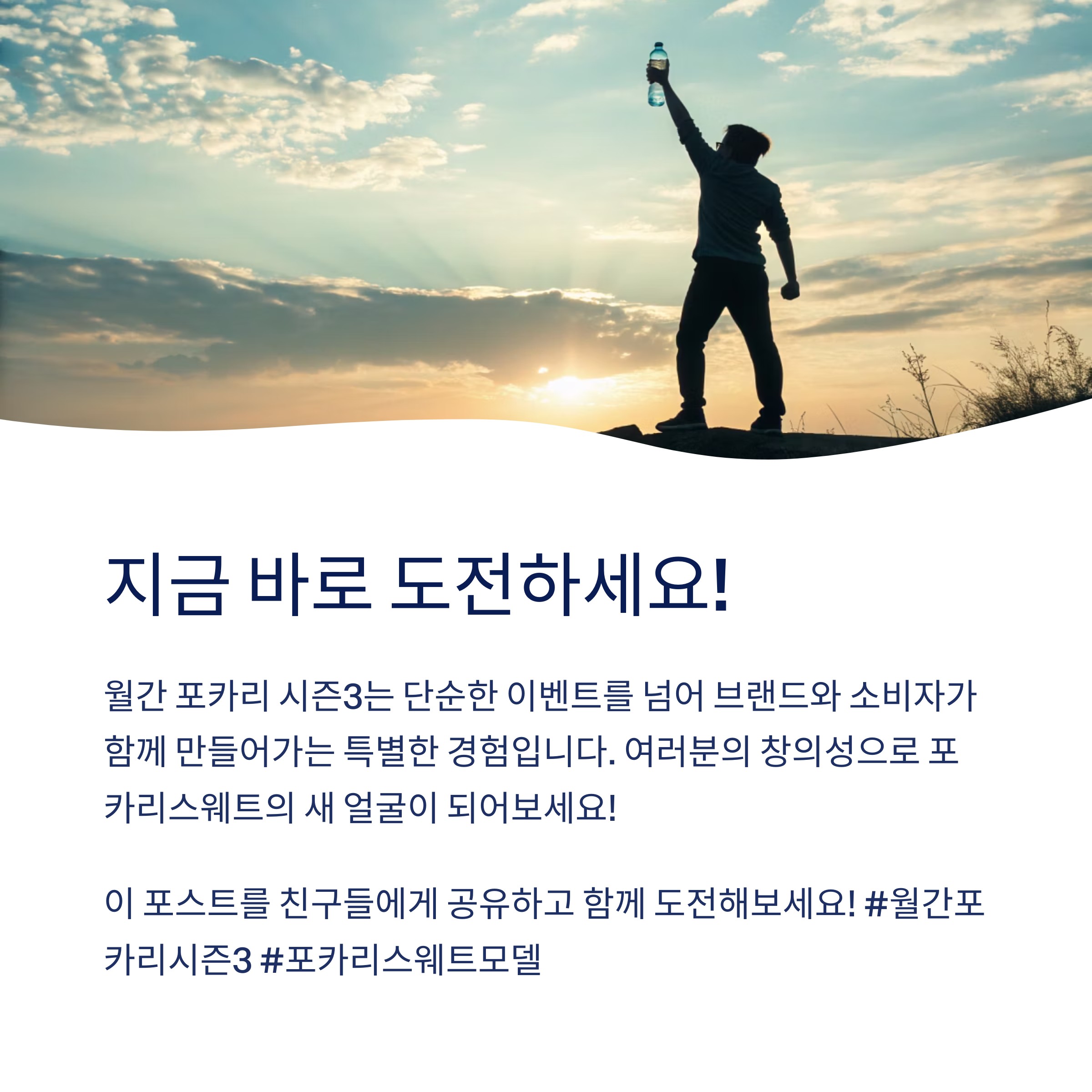 월간 포카리 시즌3는 단순한 이벤트를 넘어 브랜드와 소비자가 함께 만들어가는 특별한 경험입니다. 여러분의 창의성과 열정으로 포카리스웨트의 새로운 모습을 보여주세요!