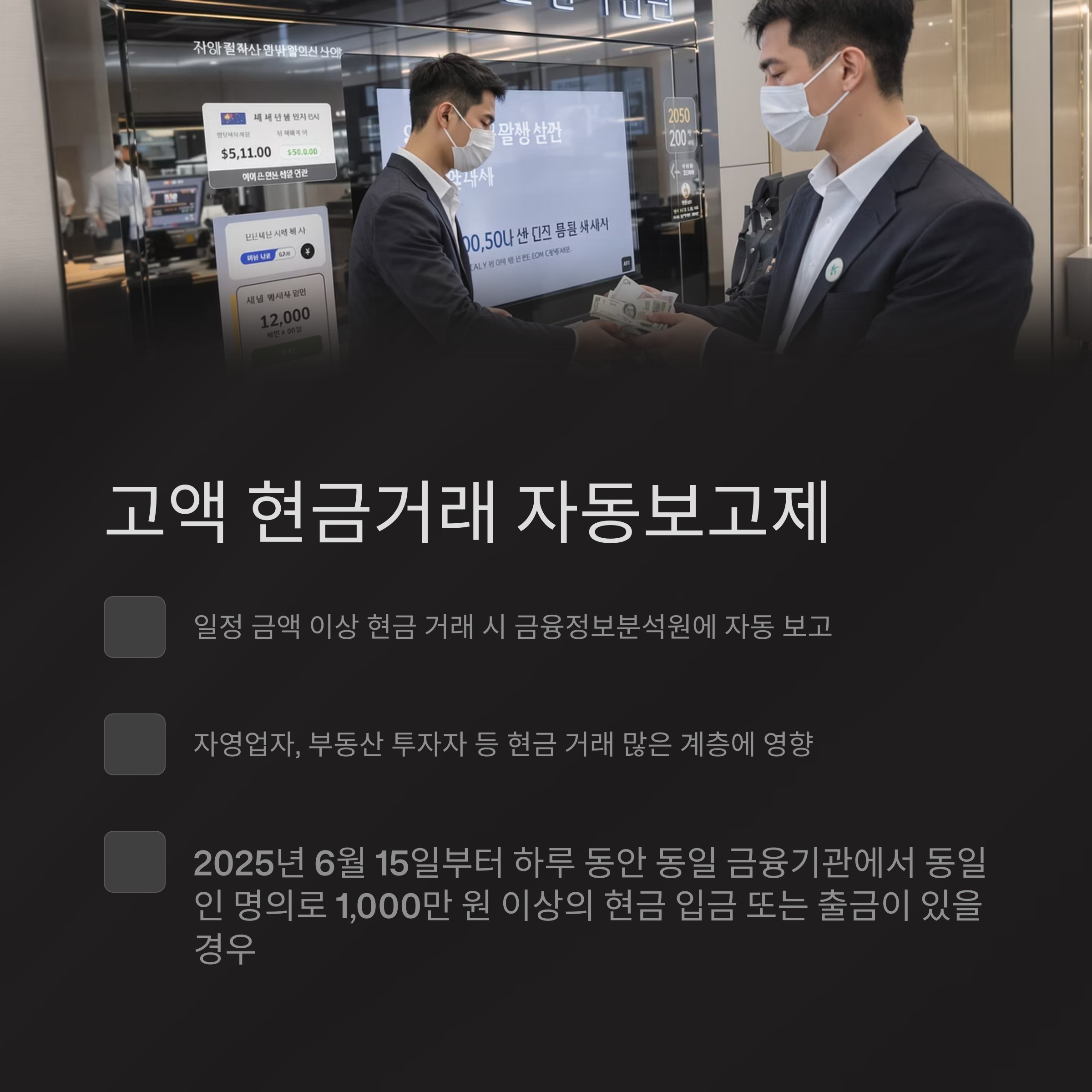 2025년 6월부터 시행된 '고액현금거래보고(CTR)' 제도는 금융기관에서 일정 금액 이상의 현금 거래 시 해당 정보가 금융정보분석원(FIU)에 자동으로 보고되는 시스템입니다.