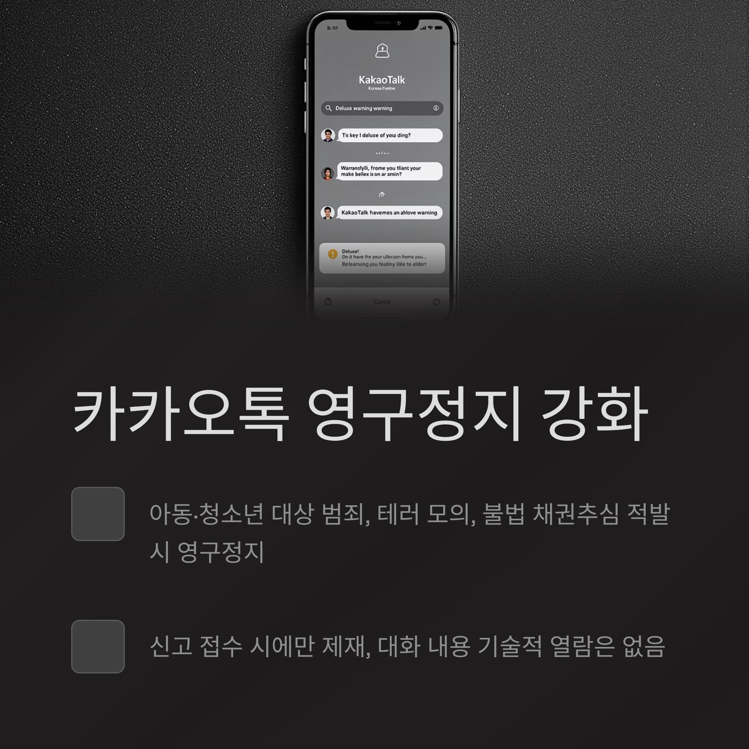 카카오가 범죄 모의와 관련된 대화에 대해 강력한 제재를 가하기 시작했습니다. 특히 아동·청소년 대상 성착취, 테러 모의, 불법 채권추심 등이 적발될 경우 카카오톡 전체 서비스 이용이 영구적으로 제한됩니다.