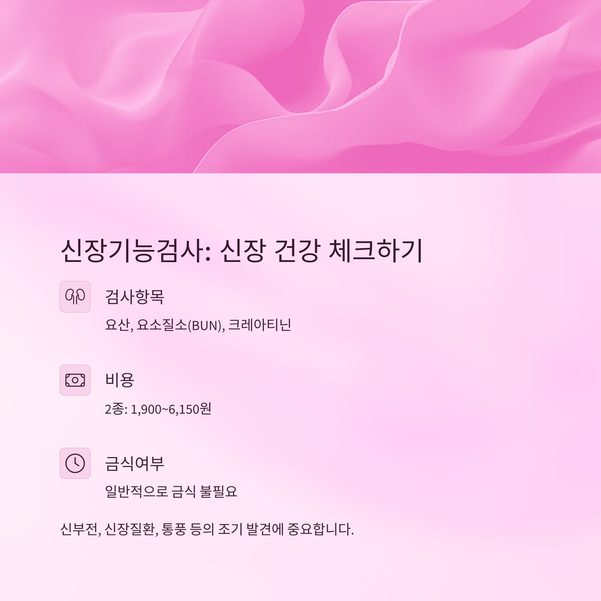 | 신장기능 | 요산, BUN, 크레아티닌 | 1,900~6,150원 | 신장질환 평가 | 보통 불필요 |
