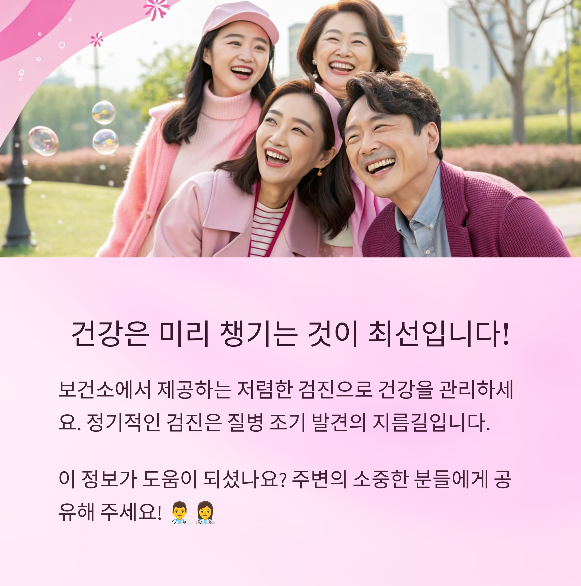 보건소 건강검진은 무료 또는 저렴한 비용으로 건강 상태를 확인할 수 있는 좋은 기회입니다. 특히 간기능, 신장기능, 혈당, 지질, 소변검사 등 기본적인 건강검진을 통해 다양한 질환을 조기에 발견하고 예방할 수 있습니다. 정기적인 건강검진으로 건강한 생활을 유지하세요!