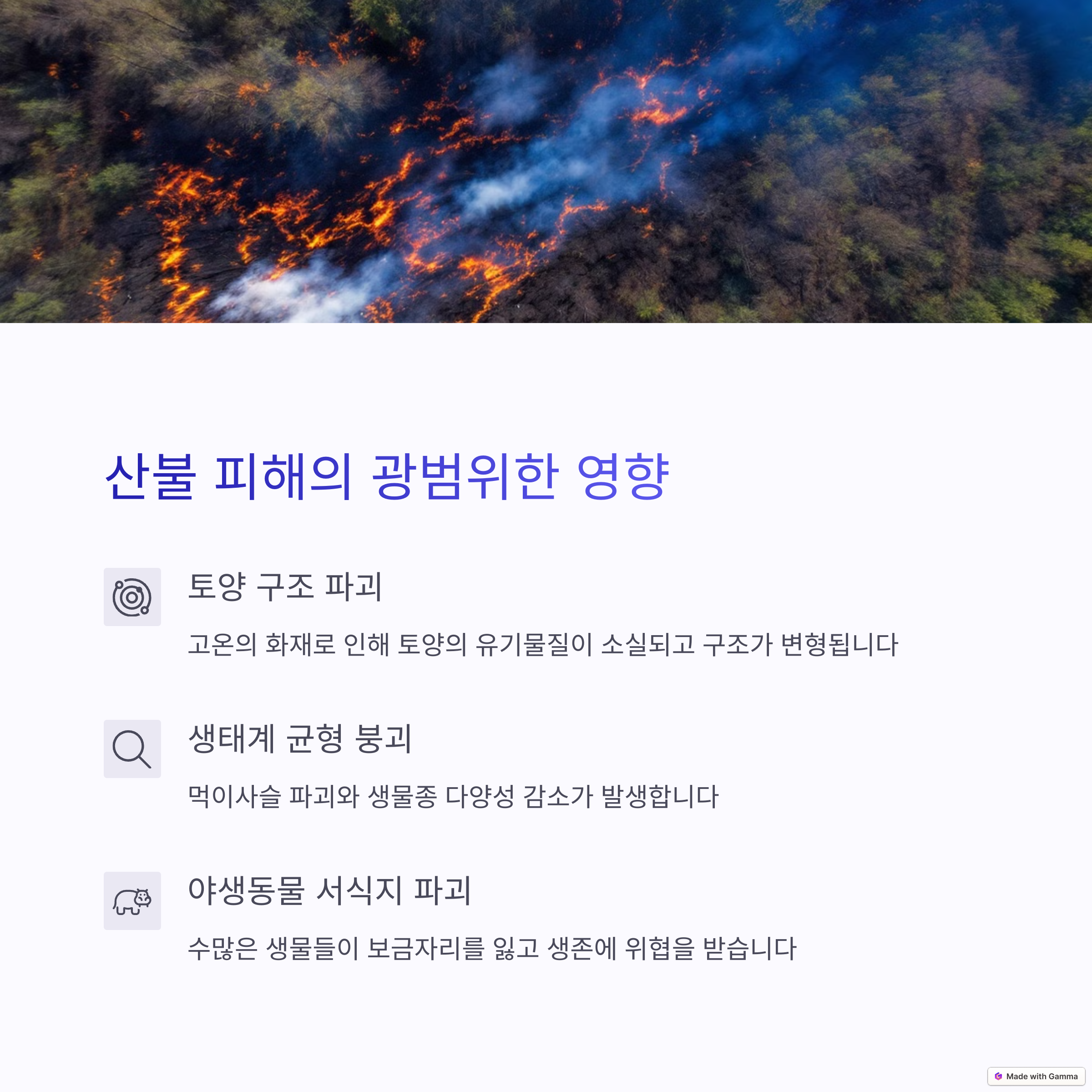 산불은 생태계 붕괴와 토양 침식, 탄소 배출 증가를 일으키는 복합 재해입니다.