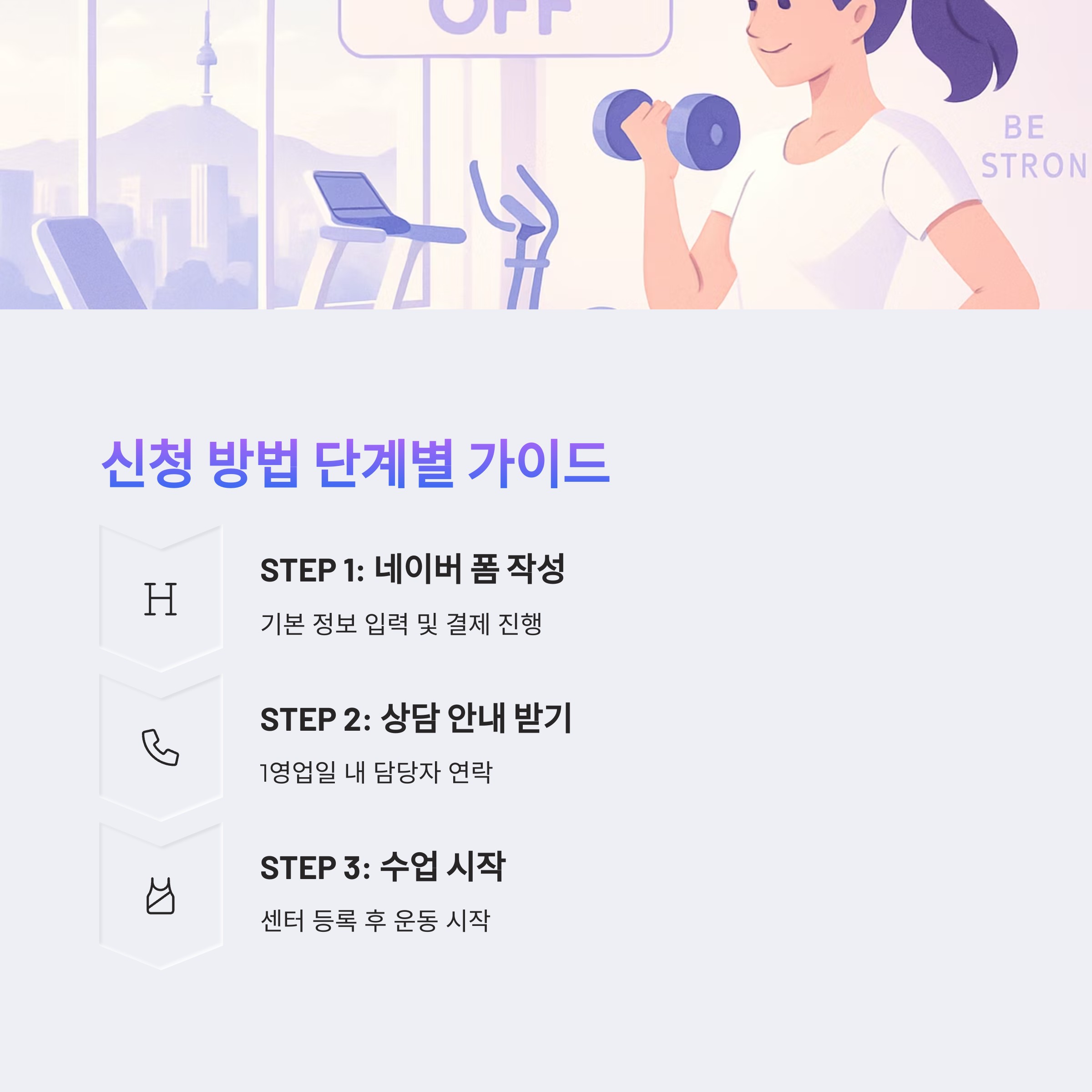 상담을 통해 운동 시간, 금액, 준비물, 시작 일정 등을 조율하고 센터에 등록하여 운동을 시작합니다. 이제 저렴한 비용으로 건강한 운동 생활을 시작할 수 있습니다!