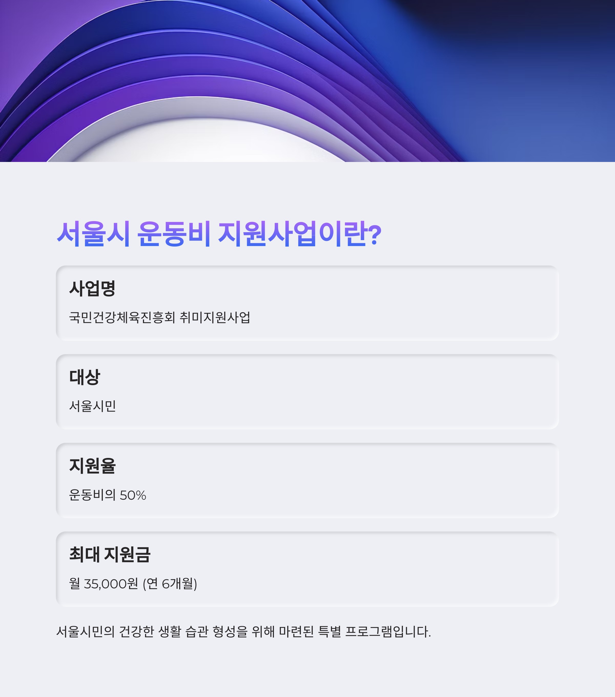 국민건강체육진흥회에서 주관하는 취미지원사업은 서울시민들의 건강한 생활 습관 형성을 위해 마련된 특별한 프로그램입니다. 이 사업의 핵심은 바로 운동비의 50%를 지원한다는 점입니다.