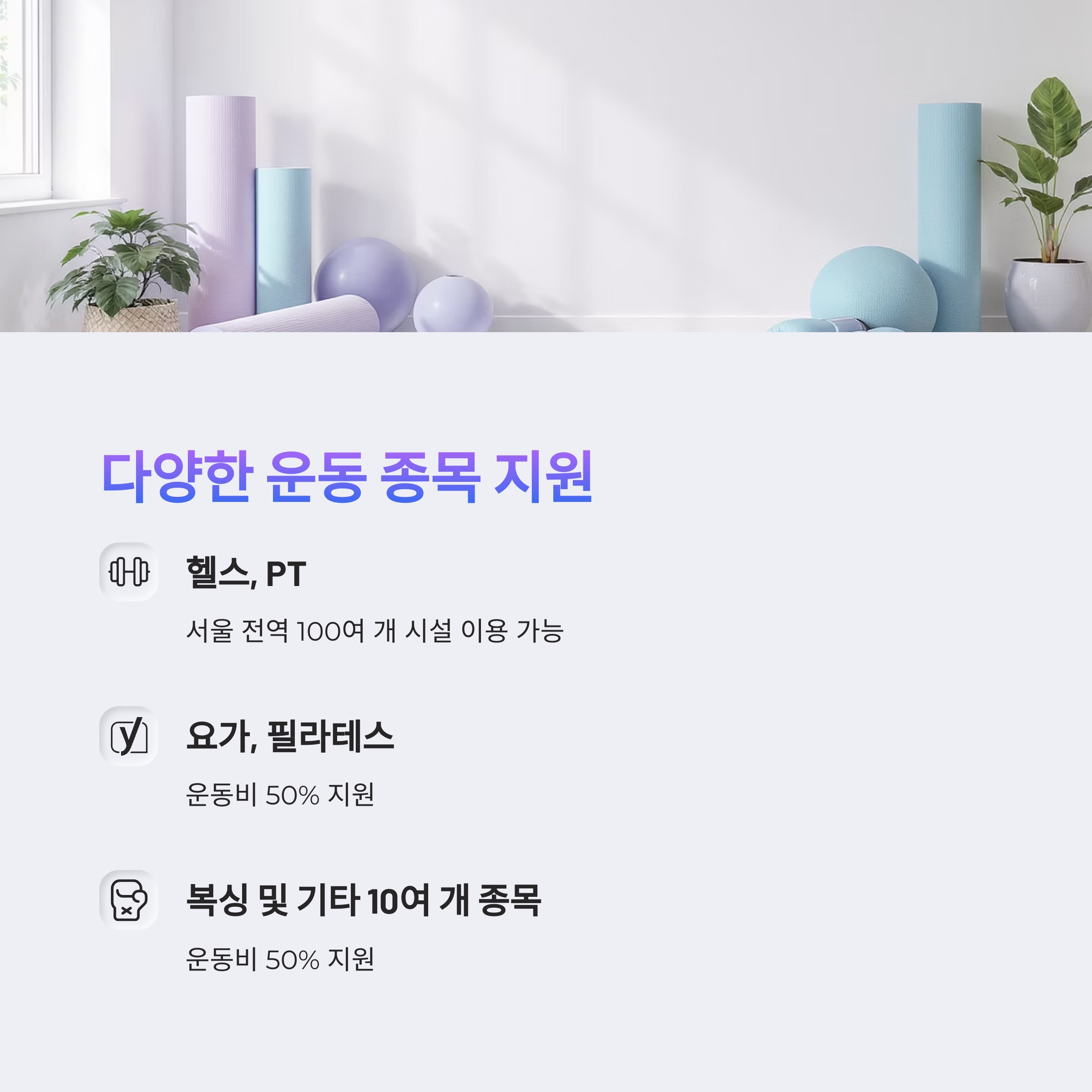 | 헬스, PT | 운동비 50% 지원 | 서울 전역 100여 개 시설 |
