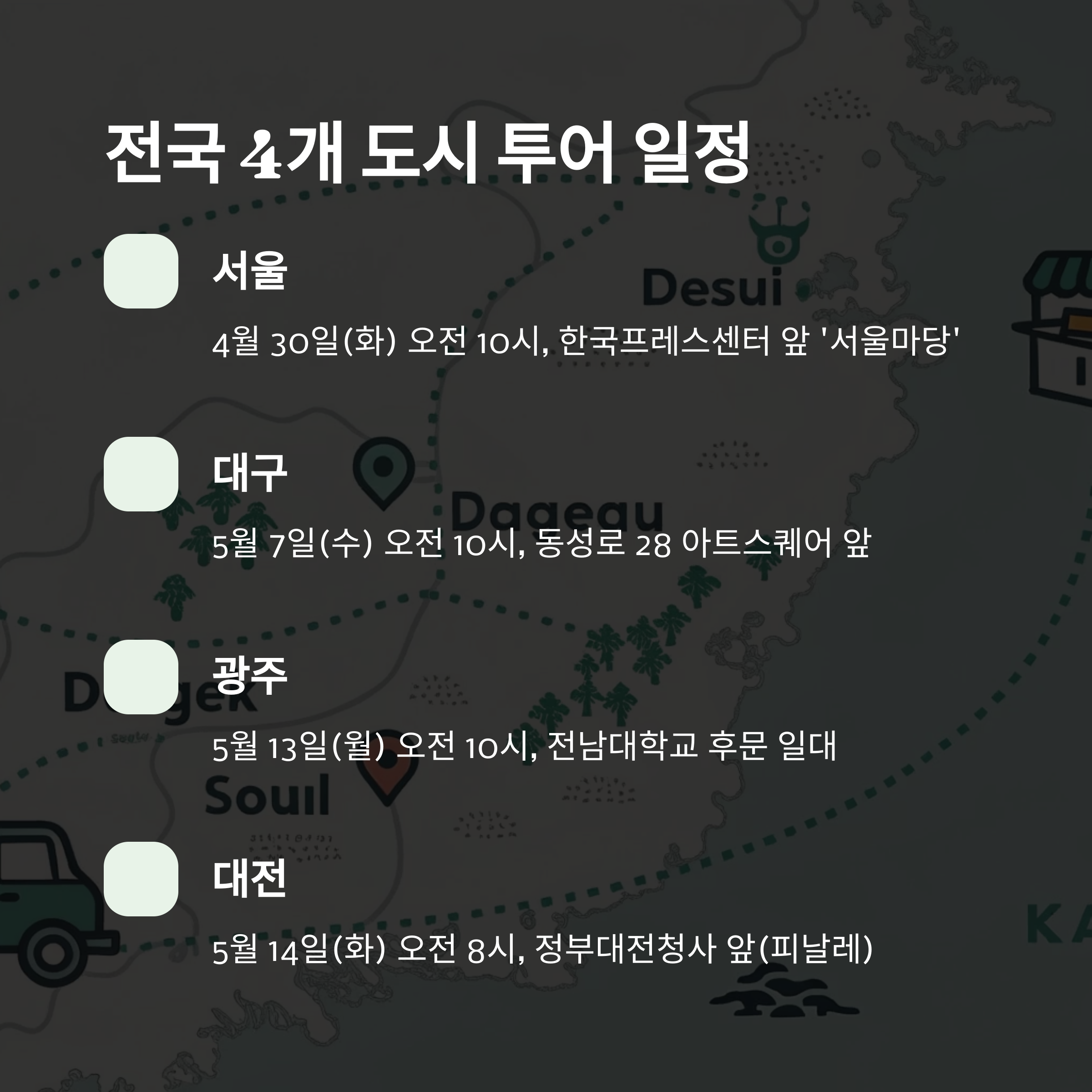 서울, 대구, 광주, 대전을 순회하는 이번 전국투어에 많은 관심과 참여 바랍니다. 특히 5월 14일 대전에서 펼쳐지는 피날레 행사는 더욱 특별한 프로그램으로 여러분을 기다리고 있습니다.