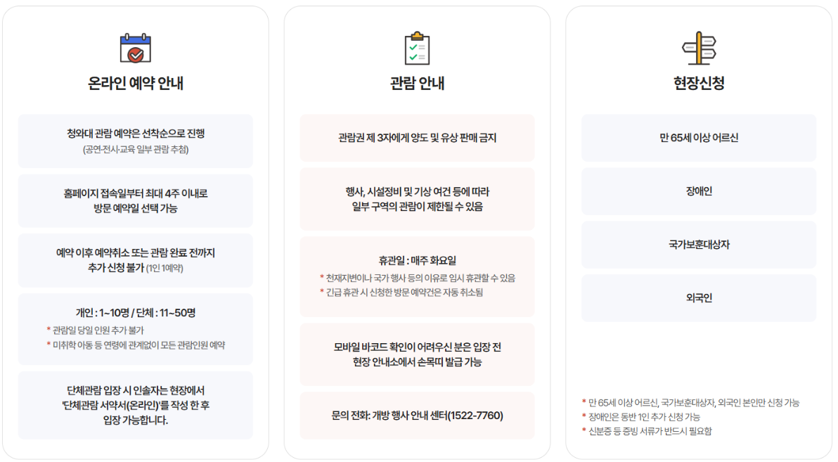 - 예약 확인 문자 수령: 예약이 성공하면 입장용 바코드가 포함된 문자가 발송되며, 이는 현장에서 필수로 제시해야 합니다. - 공식홈페이지 : https://www.opencheongwadae.kr
