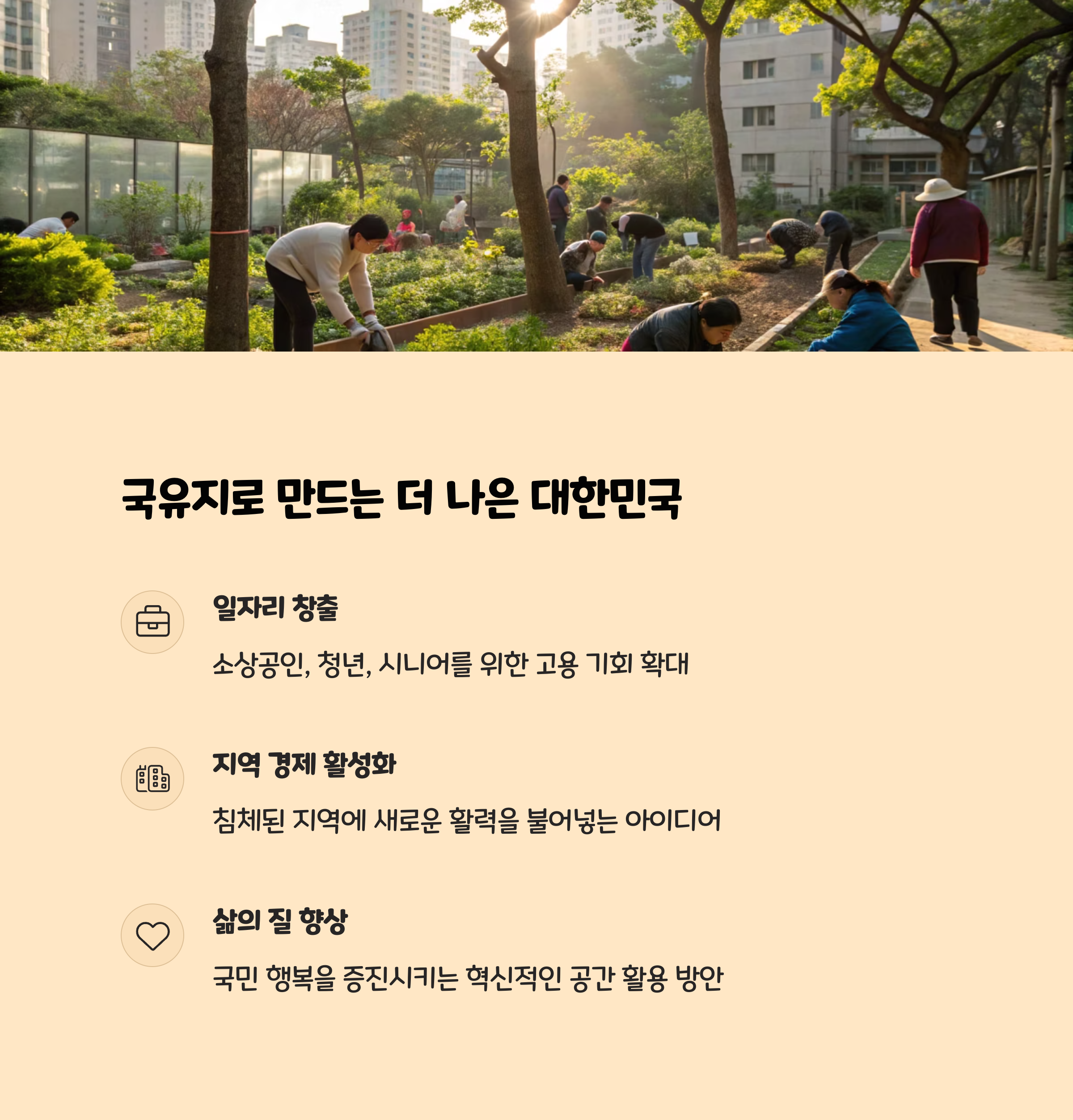 • 목적: 유휴 국유재산 활용을 통한 일자리 창출 및 지역경제 활성화