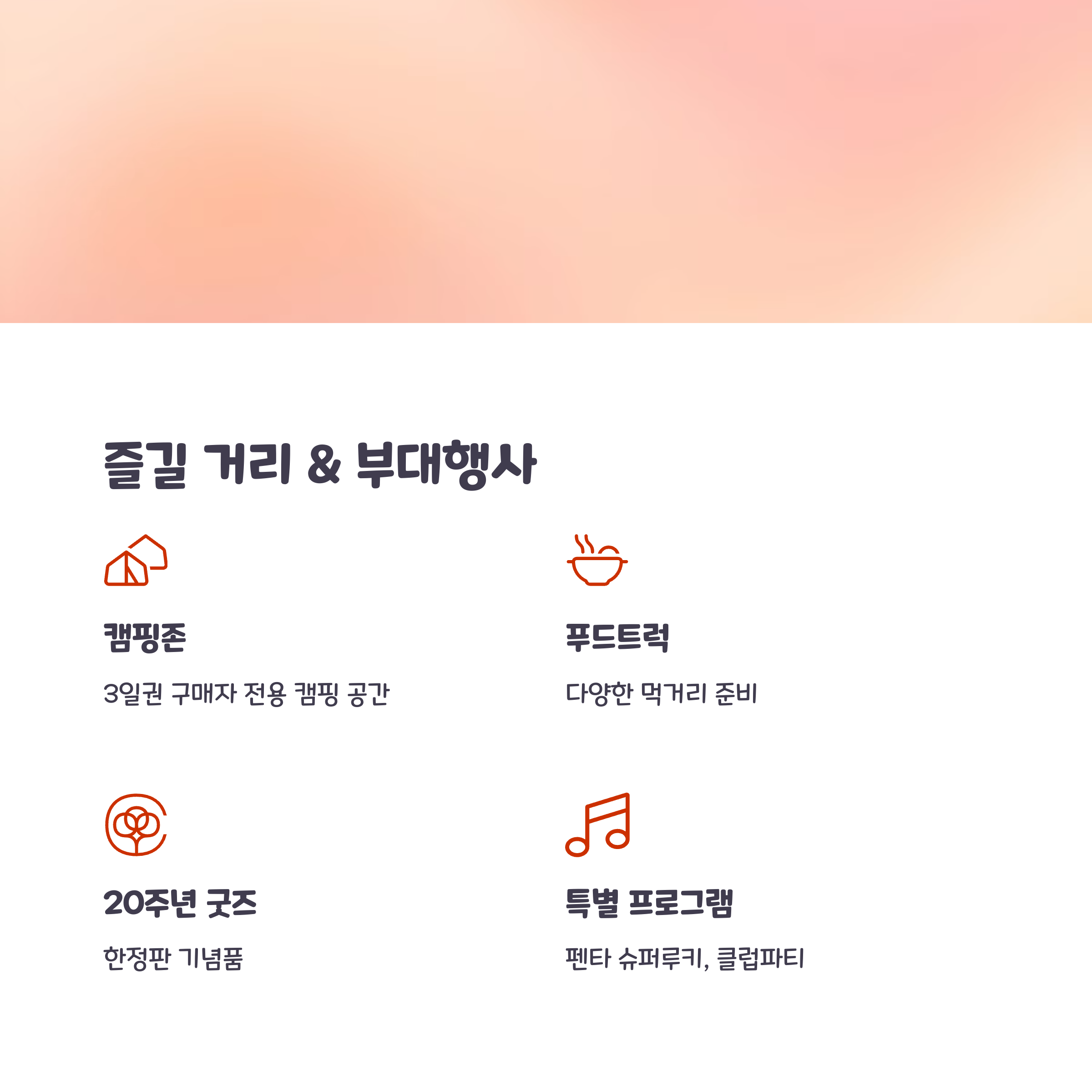 - 20주년 한정판 굿즈 (MD) 판매: 펜타포트 20주년을 기념하는 특별 디자인의 MD 상품들이 판매될 예정입니다. 소장 가치가 높은 아이템들을 기대해 보세요.