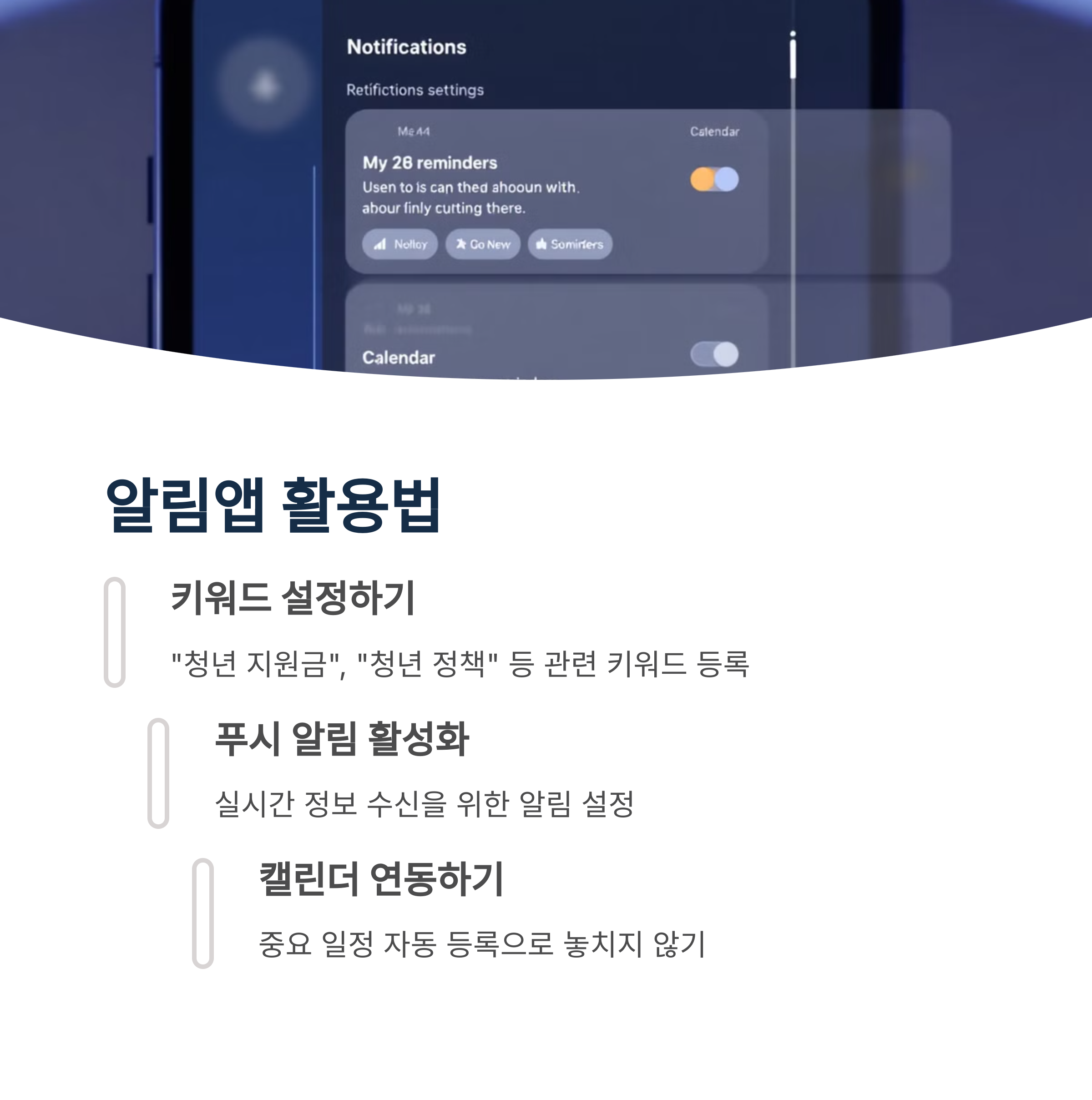 알림앱은 청년 지원 정책 정보를 자동으로 받아볼 수 있는 매우 유용한 도구입니다. 내가 원하는 조건을 설정해두면 관련 공고가 올라오는 즉시 푸시 알림으로 알려주기 때문에 놓칠 염려가 없어요. 특히 복잡한 정부 사이트에 접속할 필요 없이, 앱 하나로 간편하게 모든 정보를 확인할 수 있다는 것이 큰 장점입니다. 주기적으로 설정만 해두면 자동으로 최신 정보가 갱신되어 아주 편리하답니다.