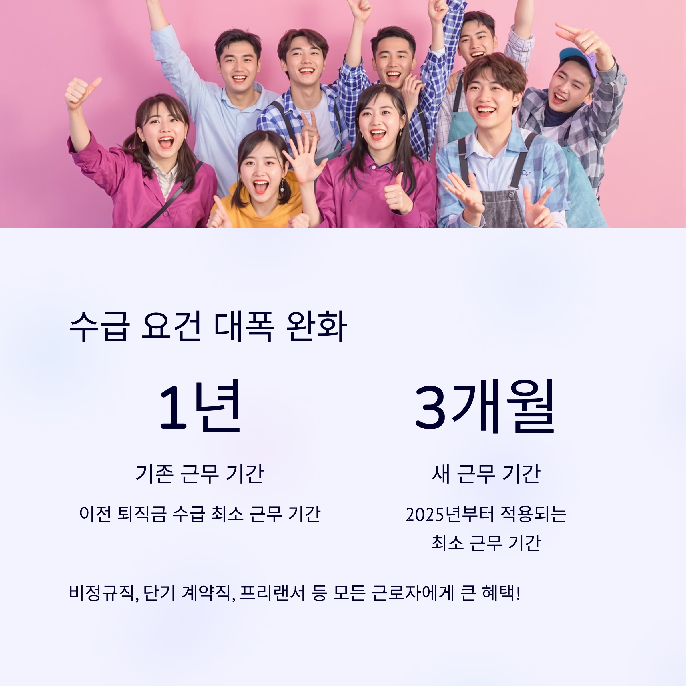 이번 개편에서 가장 근로자 친화적인 변화 중 하나는 수급 요건의 완화입니다. 기존에는 1년 이상 근무해야만 퇴직급여를 받을 수 있었지만, 앞으로는 단 3개월만 근무해도 퇴직연금 수급 권리가 발생합니다.