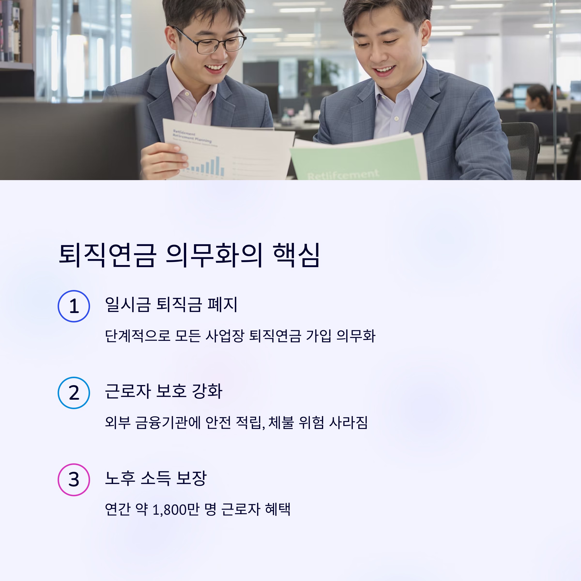 "퇴직연금 의무화로 연간 약 1,800만 명의 근로자가 더 안전하고 체계적인 노후 준비를 할 수 있게 됩니다."