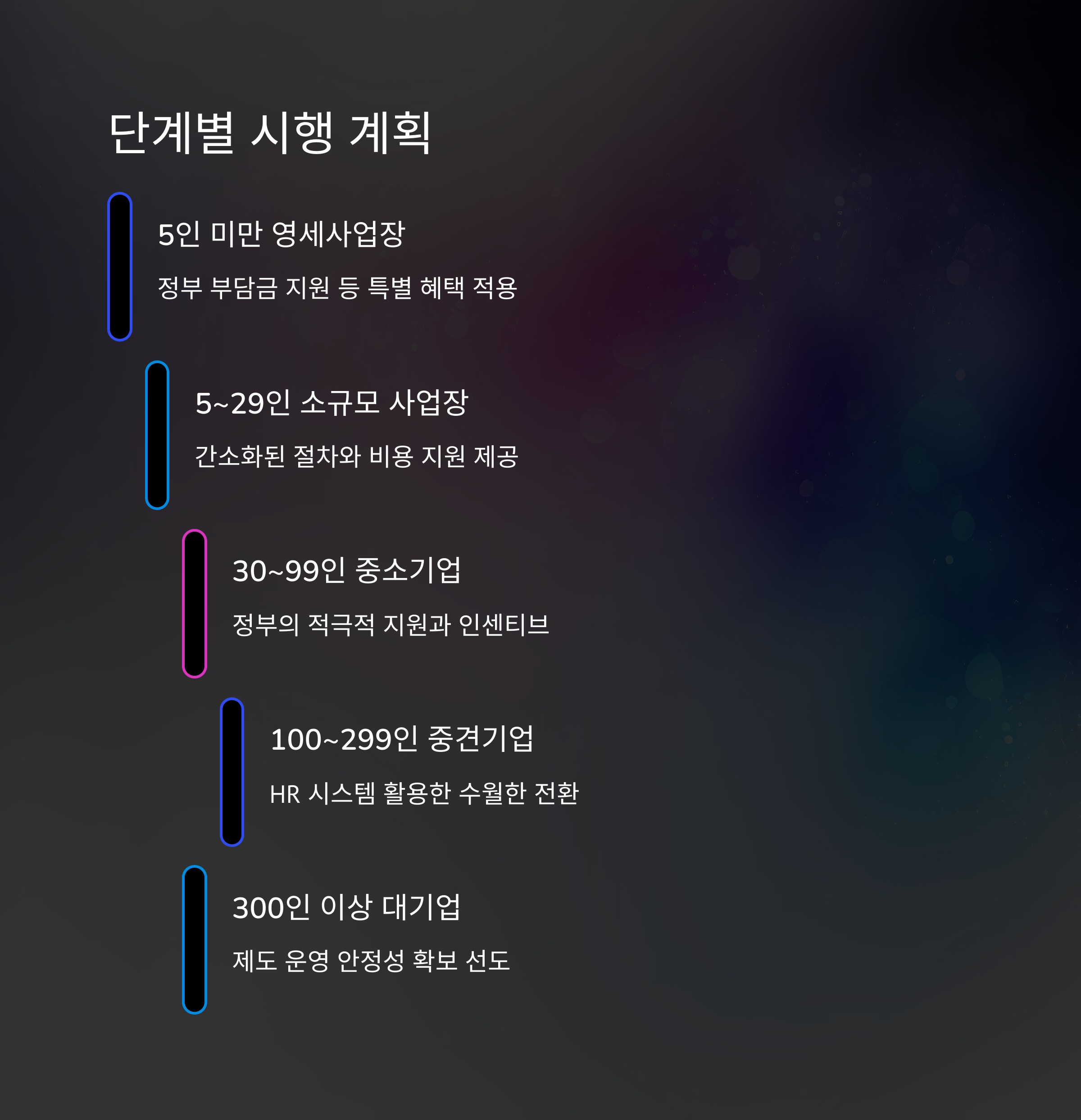 정부는 기업의 준비 기간을 고려하여 5단계에 걸쳐 점진적으로 확대 적용하기로 했습니다. 이는 중소기업과 소상공인들의 부담을 최소화하면서도 확실한 제도 정착을 도모하기 위한 전략입니다.