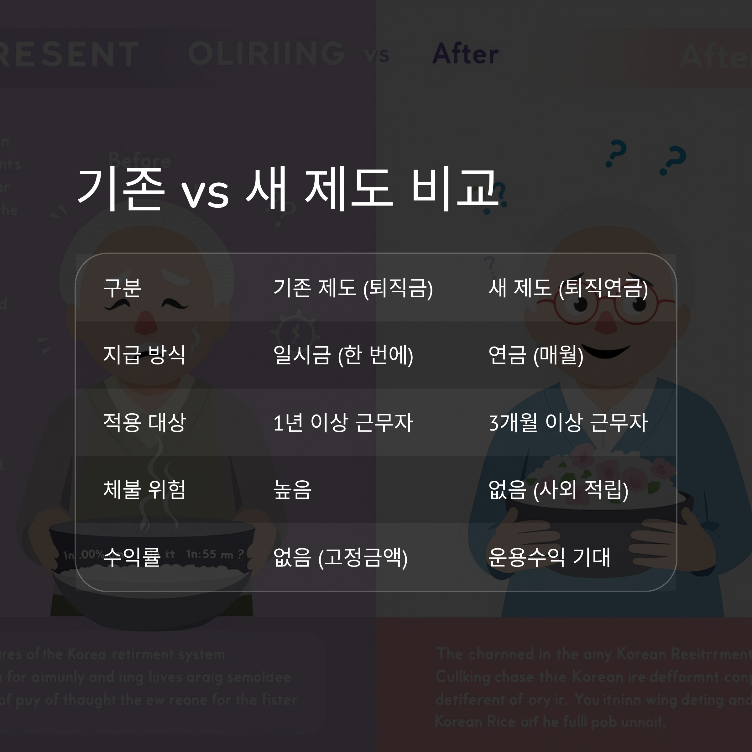 표에서 보듯이 새로운 제도는 거의 모든 면에서 근로자에게 유리합니다. 특히 체불 위험이 사라지고, 운용 수익을 기대할 수 있으며, 더 많은 근로자가 혜택을 받을 수 있다는 점이 가장 큰 장점입니다.