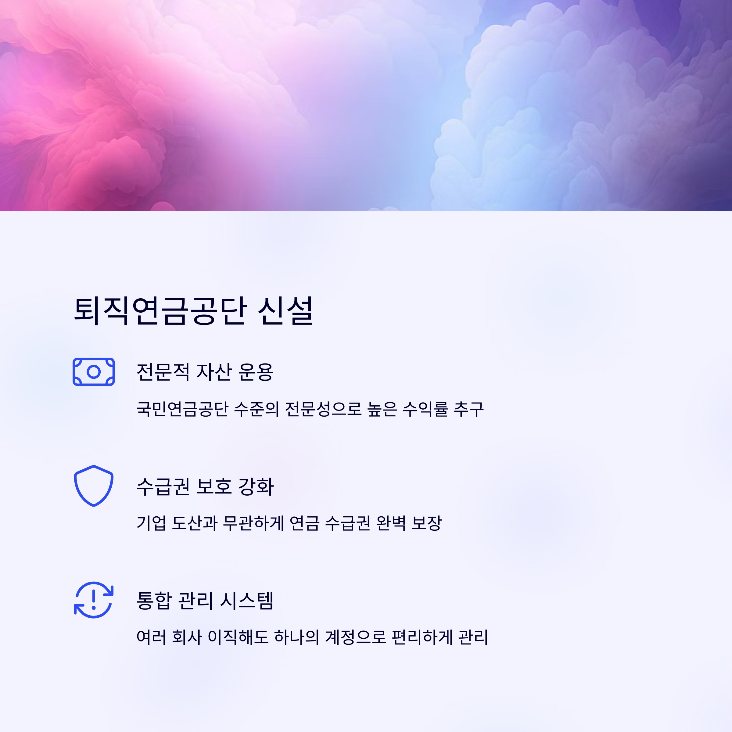 새롭게 신설되는 퇴직연금공단은 이번 제도 개편의 핵심 기관입니다. 이 공단은 단순히 관리 업무만 하는 것이 아니라, 적극적인 운용을 통한 수익률 제고근로자 수급권 보호라는 두 가지 중요한 역할을 담당합니다.