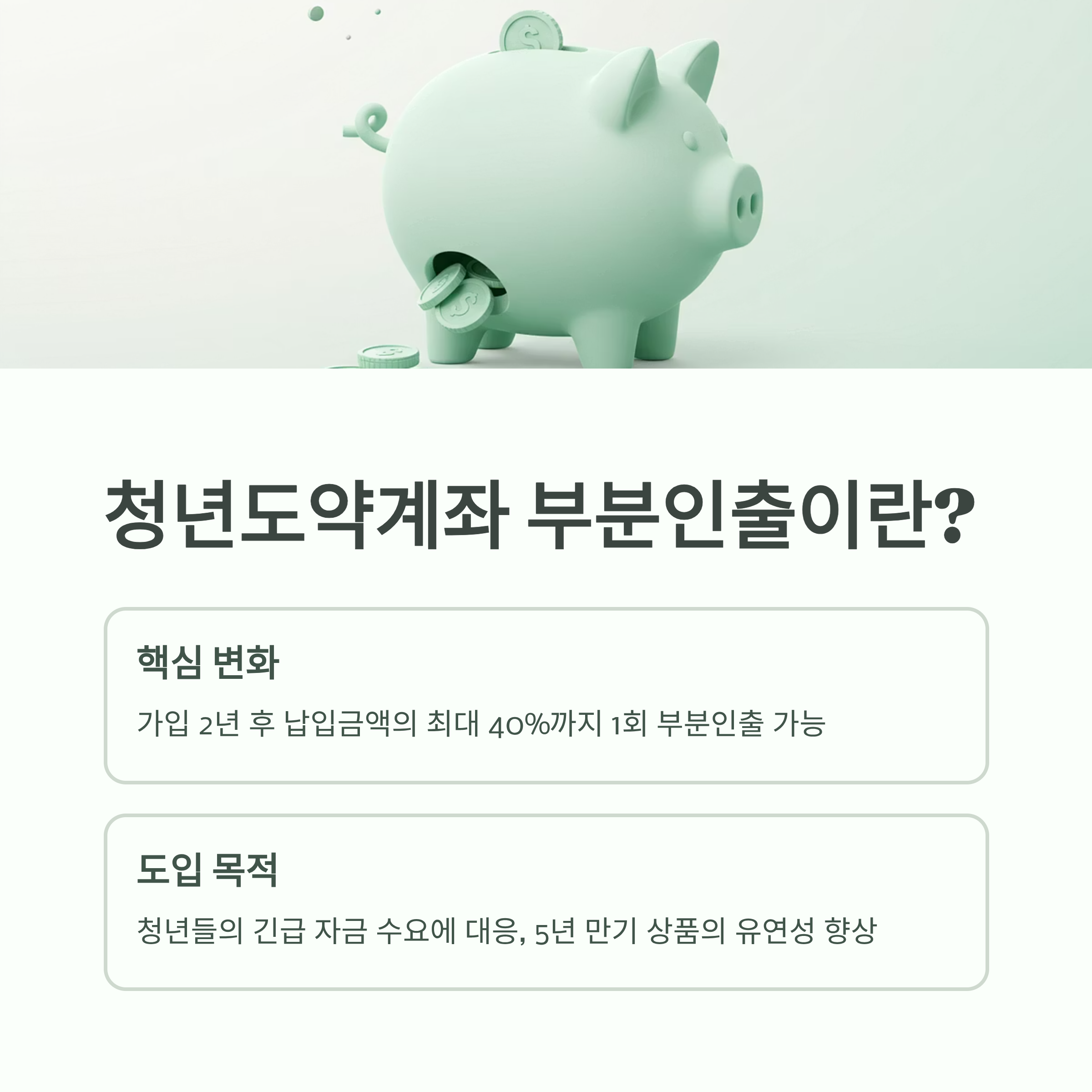 핵심 포인트: 청년도약계좌 가입 후 2년이 지나면 납입 금액의 최대 40%까지 1회에 한해 부분인출이 가능해졌습니다.