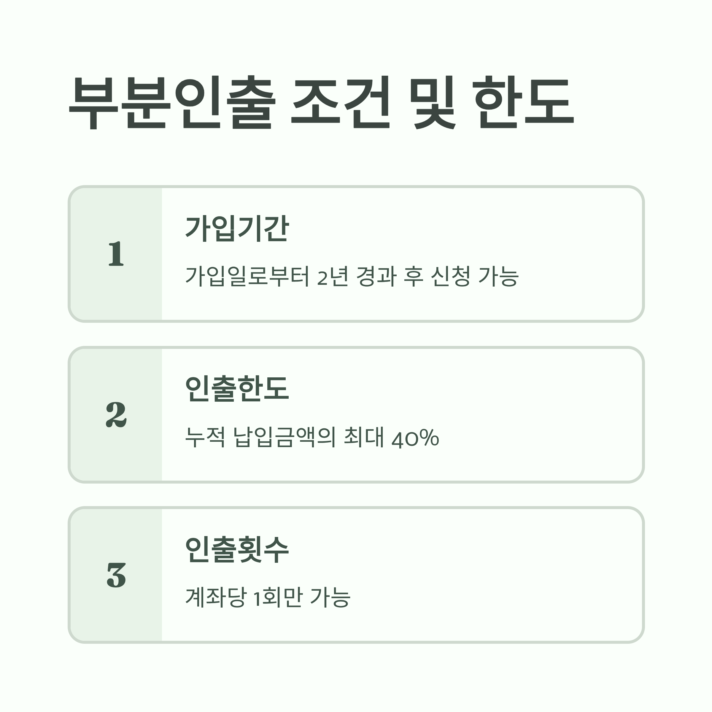 | 인출한도 | 최대 40% | 누적 납입금액 기준 |