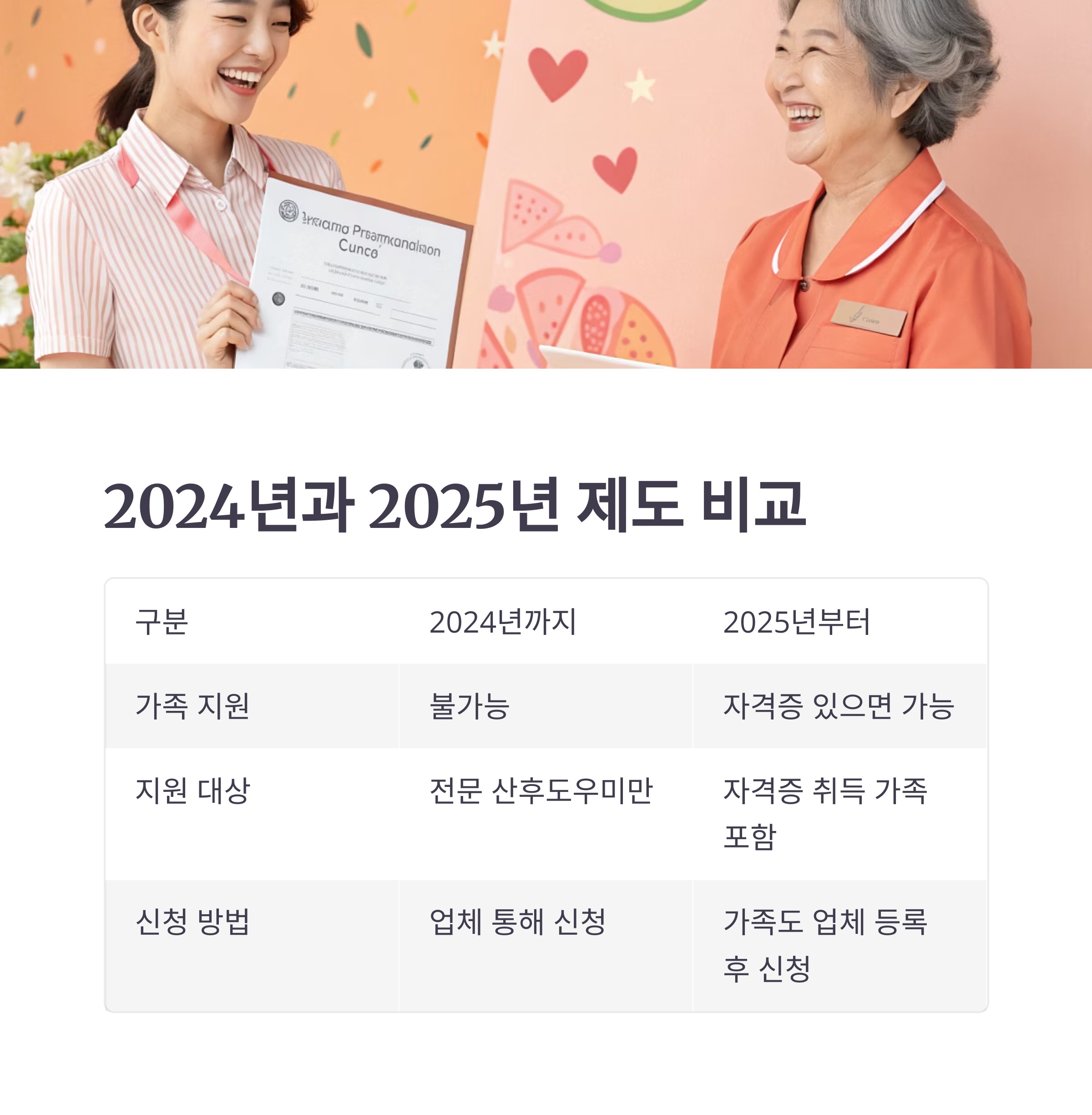 | 지원 대상 | 전문 산후도우미만 | 자격증 취득한 친정엄마, 시어머니, 가족 포함 |