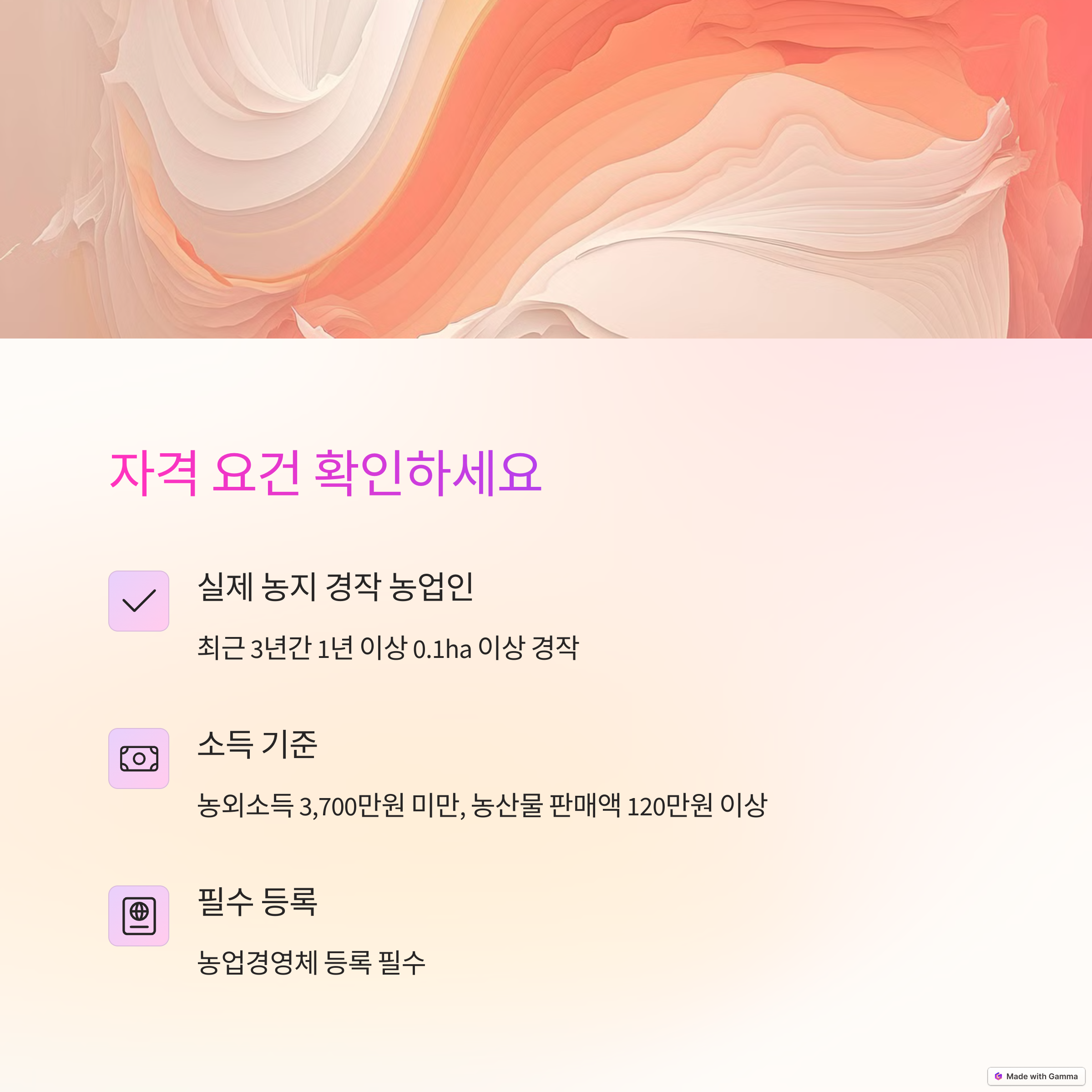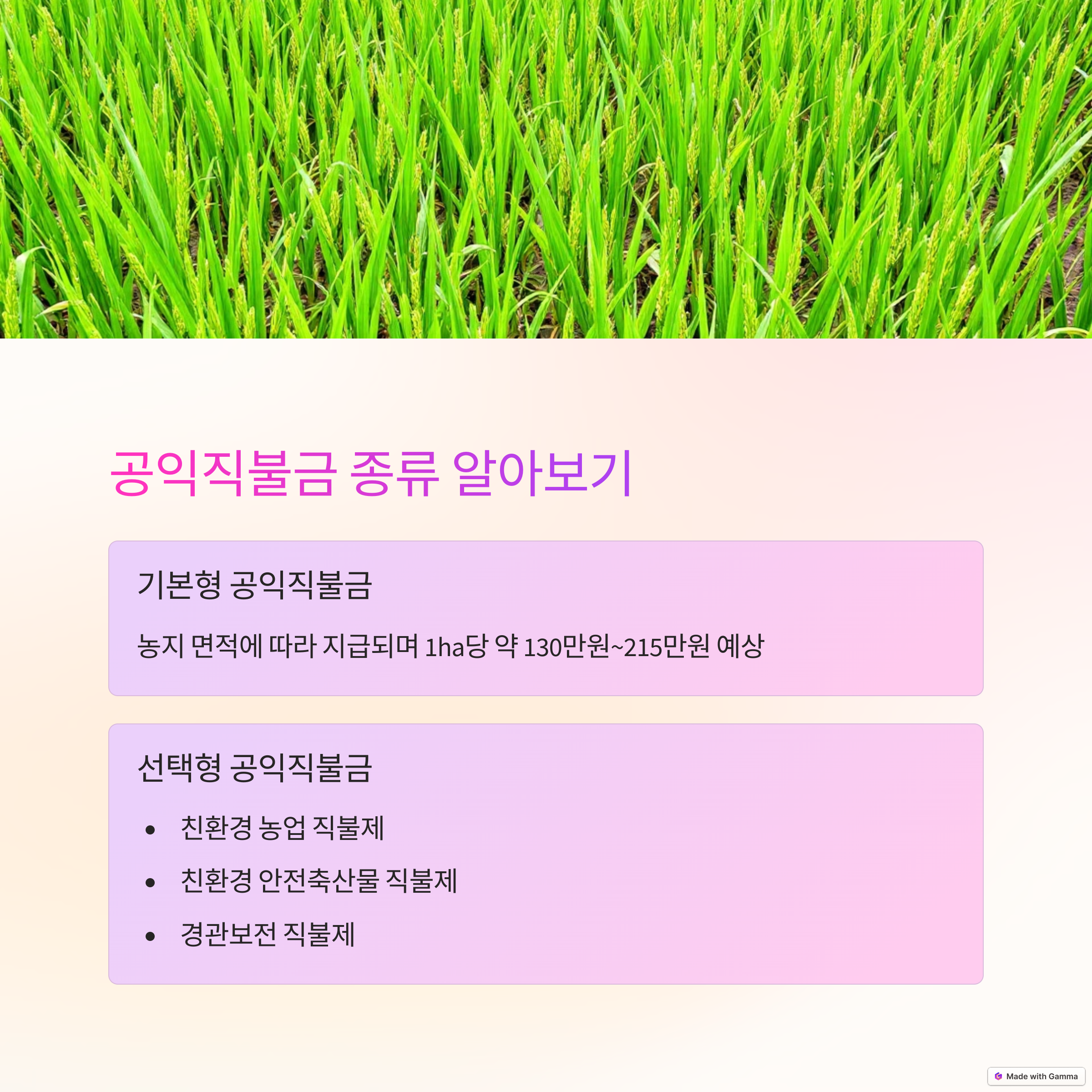 공익직불제는 농업·농촌의 지속가능성과 공익적 가치를 증진하기 위해 도입된 제도로, 농업인의 안정적인 소득 보전과 함께 친환경적인 영농을 유도하는 것이 핵심 목표입니다. 일정 자격을 갖춘 농업경영체 등록 농업인이면 신청할 수 있으며, 기본직불금과 선택직불금으로 구성되어 있어요.