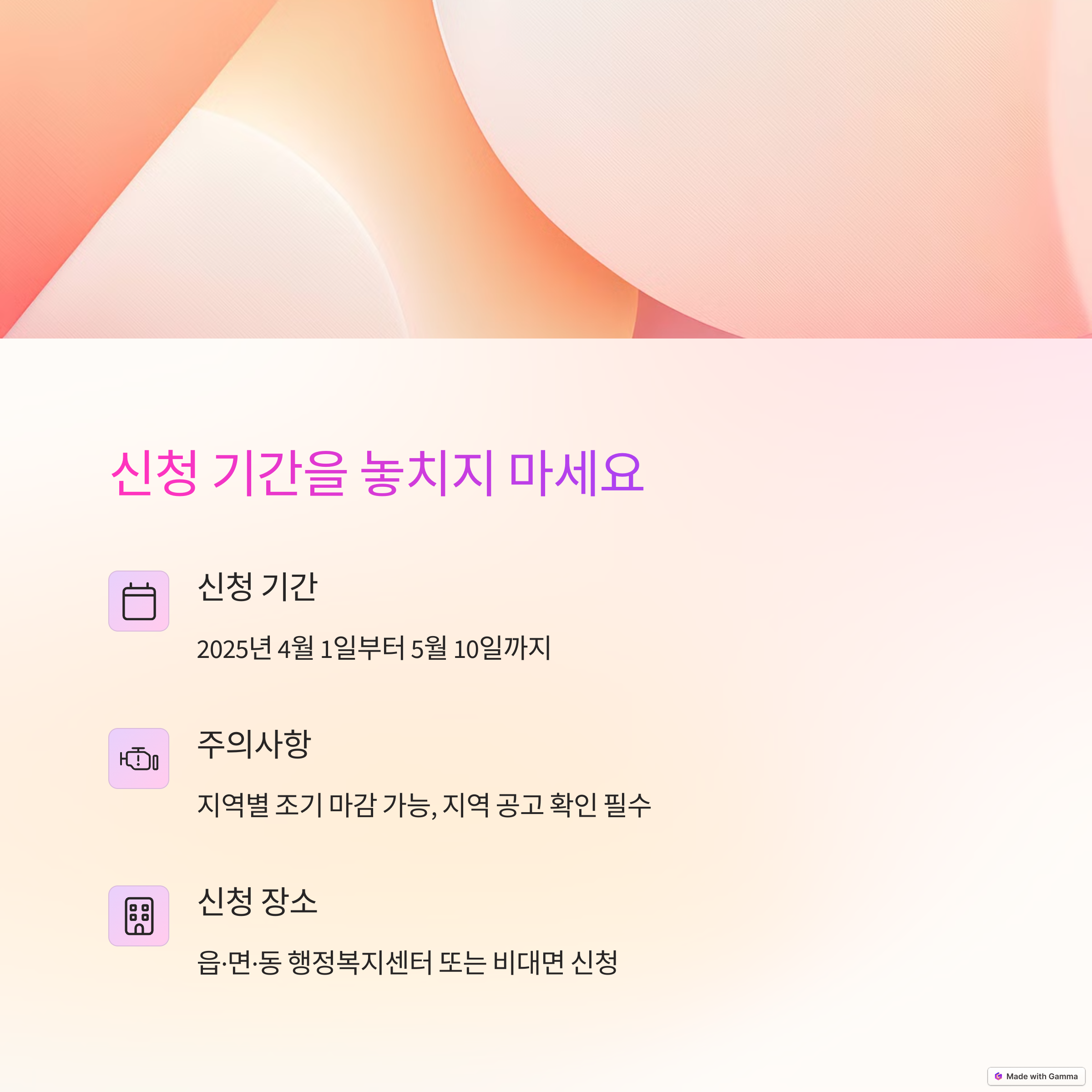 접수 마감일은 시군구별로 다를 수 있으며, 일부 지역은 4월 중순 이전에 조기 마감되기도 합니다. 이를 방지하려면 거주지 관할 지자체에서 안내하는 접수 공고를 꼭 참고하시고, 가능한 빨리 접수하는 것이 좋습니다.