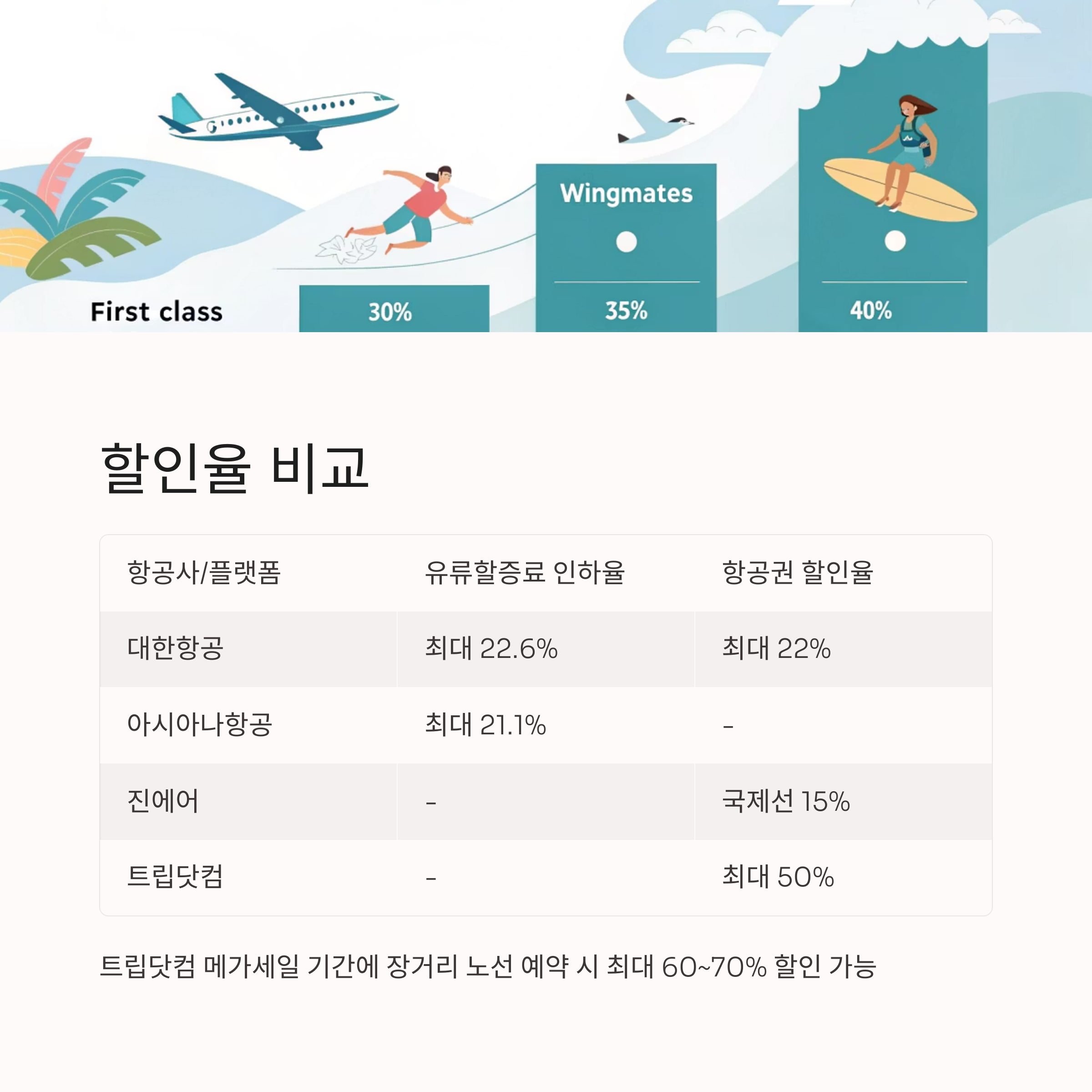 항공사별, 플랫폼별 할인율과 적용 기간을 꼼꼼히 확인하고, 카드사 제휴 할인 등 추가 혜택까지 활용한다면 더욱 저렴하게 항공권을 구매할 수 있습니다. 각자의 여행 계획에 맞는 최적의 선택으로 즐거운 여행이 되시길 바랍니다.