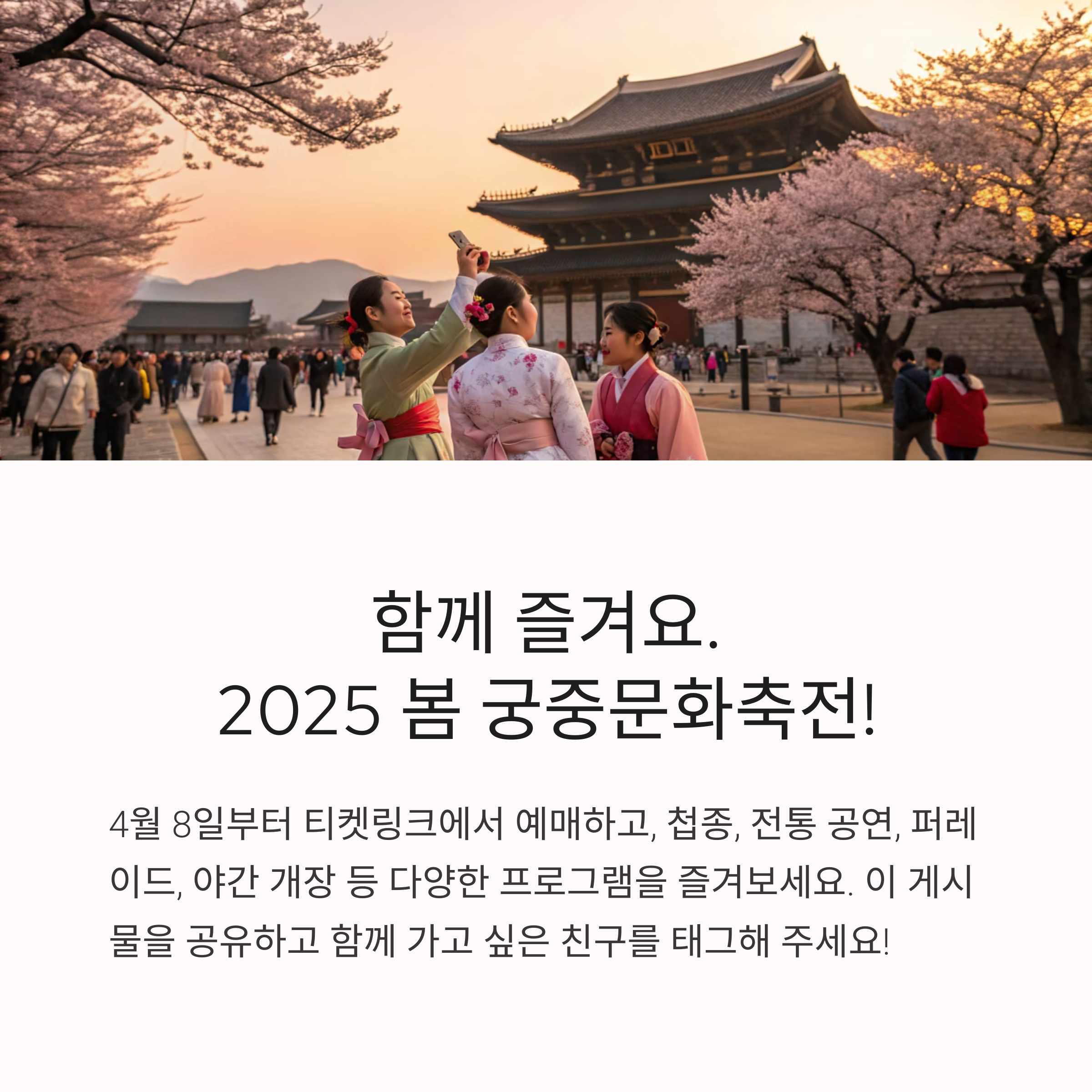 2025 봄 궁중문화축전은 4월 26일부터 5월 4일까지 서울 5대 고궁과 종묘에서 열리며, 다양한 전통문화 체험과 공연이 준비되어 있습니다. 사전예매는 티켓링크에서 4월 8일부터 시작되며, 인기 프로그램은 조기 매진될 수 있으니 빠른 예매가 필요합니다. 5대 고궁을 자유롭게 관람할 수 있는 궁패스도 판매 중이니, 축제 기간 동안 고궁 나들이를 계획하는 분들께 추천합니다.