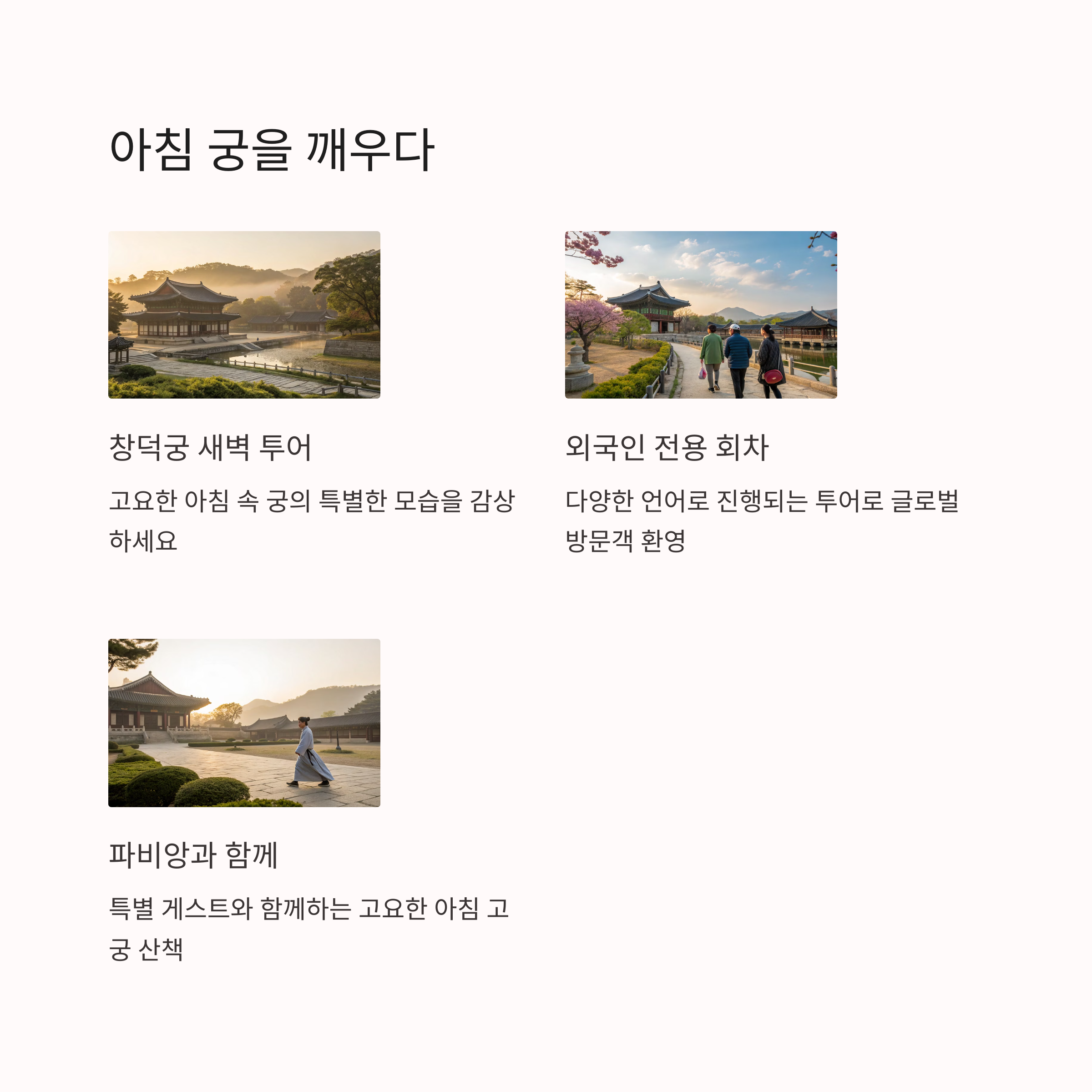 • 각 고궁별로 계절, 행사 일정에 따라 프로그램이 달라질 수 있으니, 공식 홈페이지 및 예매처에서 상세 일정을 확인하는 것이 좋습니다.