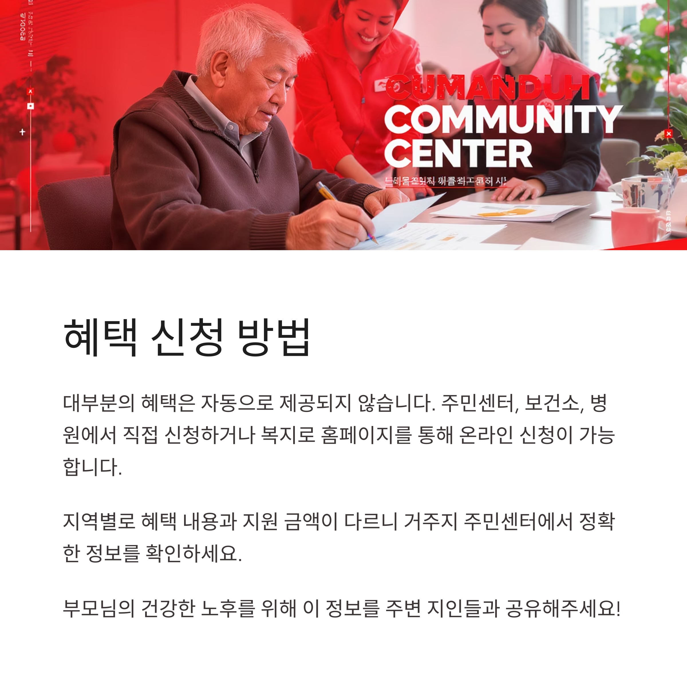 부모님의 소중한 건강과 경제적 부담을 덜어드릴 수 있는 모든 혜택을 한 번에 정리했습니다.