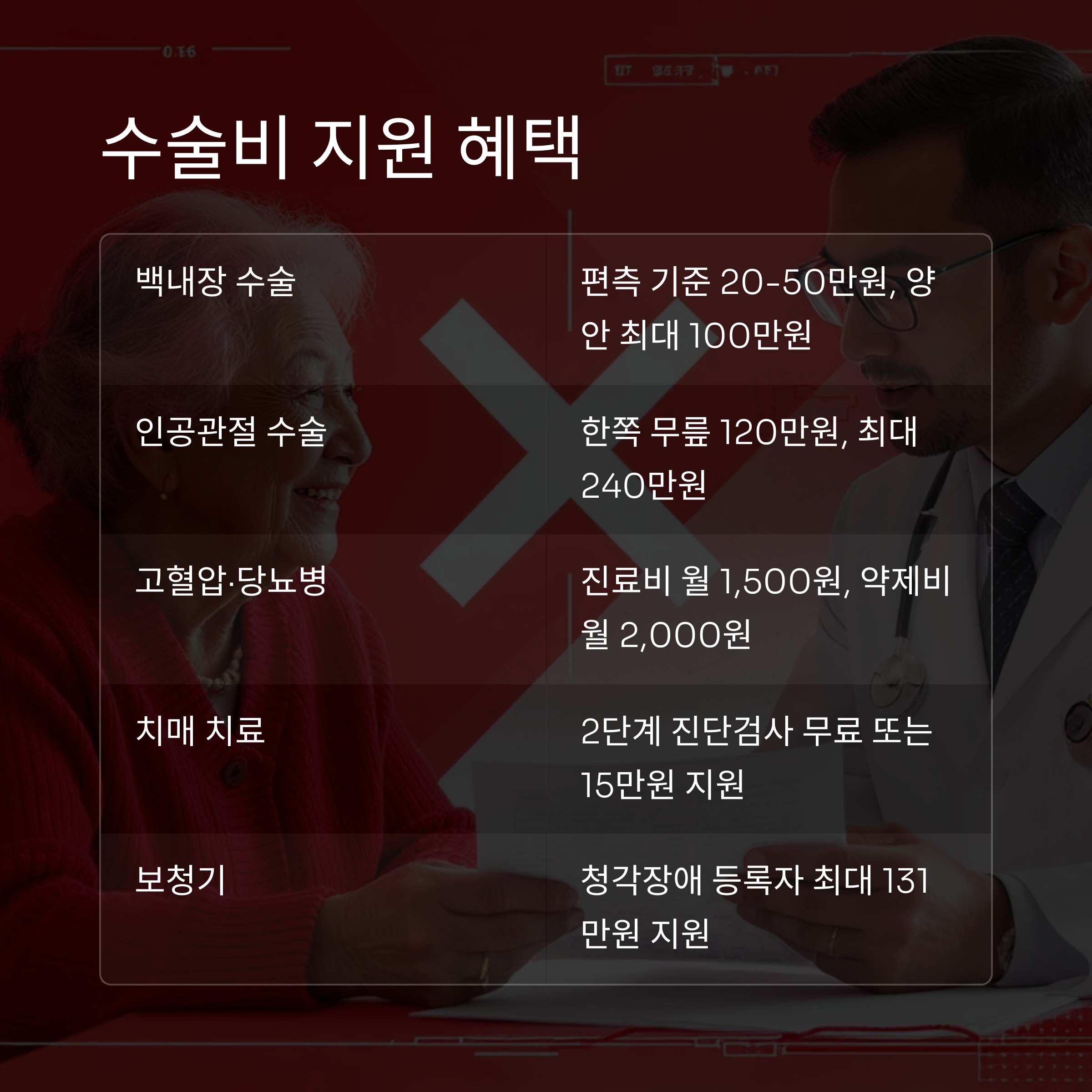 | 인공관절 수술비 | 만 60세 이상 의료급여수급자 | 한쪽 무릎 기준 120만원, 최대 240만원 |