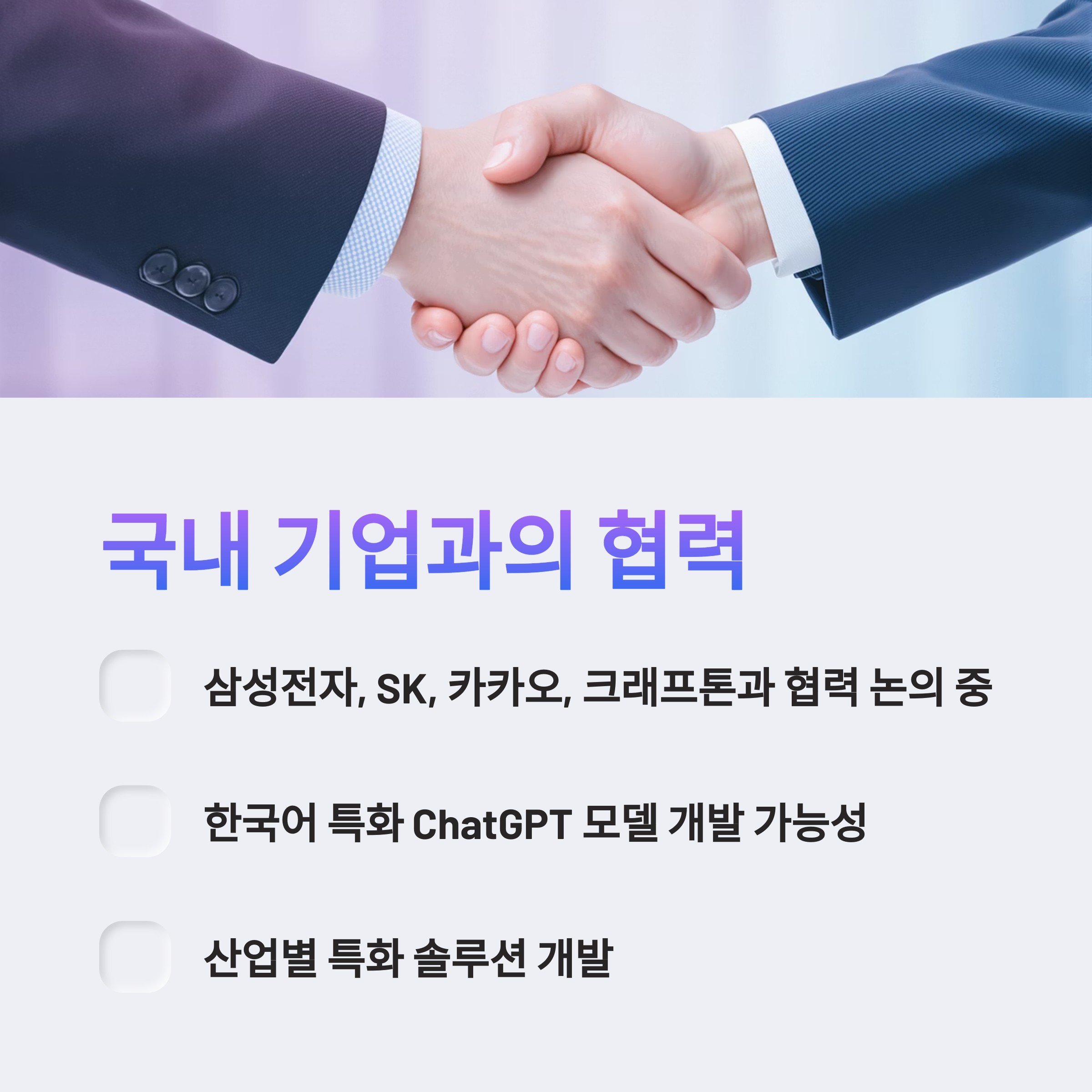 현재 삼성전자, SK, 카카오, 크래프톤 등 국내 주요 기업과 협력 논의가 진행 중입니다. 특히 카카오와의 협업을 통한 한국어 특화 ChatGPT 모델 개발 가능성도 언급되고 있습니다.